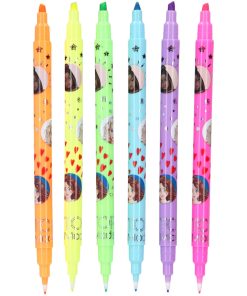 A real (colour) pop set: 6 double fibre-tip markers from TOPModel in great neon colours (yellow, orange, green, blue, purple, pink). With fineliner tip (0.5 mm) on one side and a flat marker tip (1-3 mm) on the other. Packed in a transparent box.