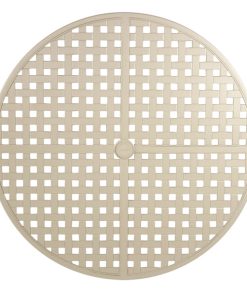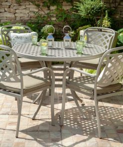 - Set includes: 1 x Round Dining Table, 4 x Dining Chairs, 2.5m Round Traditional Parasol (UPF50+) and 15kg Concrete Base (not suitable on some composite decking – check with your manufacturer)