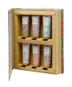 A library set of six Bergamot & Vetiver pocket hand creams in earth-friendly Kraft paper tubes decorated with recoloured iconic designs from William Morris.