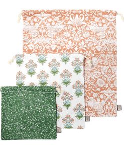 A set of three useful and beautiful drawstring bags crafted from 100% organic cotton printed with William Morris designs, using sustainable inks. Styled to help carry your shopping with an eco-conscious mind.