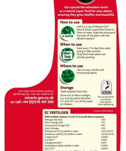 Miracle-Gro Rose and Shrub Concentrated Liquid Plant Food 1 litre contains a unique and carefully balanced mix of 9 essential nutrients required for optimum plant growth and flowering. Simply apply one capful (approx. 50ml) into 4.5 litres of water and apply 1 litre of the solution per plant around the plant to feed the roots. Start feeding when the first shoots are about 5cm long and then feed every two weeks until late summer. Warning: Keep out of reach of children. Always read instructions before use.