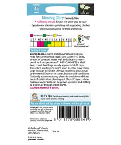 Spectacular, huge flowers of the clearest sky-blue. A beautiful and vigorous plant that loves to climb trellis and fences. 300cm x 60cm Blue Half Hardy Annual MAR-APR, JUN-OCT