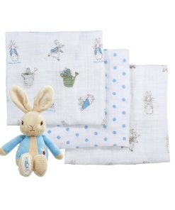 The beautiful Peter Rabbit Toy and Muslin Set from Rainbow Designs includes an adorable and baby soft Peter Rabbit soft toy and three illustrated 60cm x 60cm, 100% cotton, machine washable muslins.