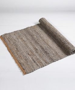 Rug woven in 90% wool and 10% jute yarn in tones of smoke and natural finished with a fringe.